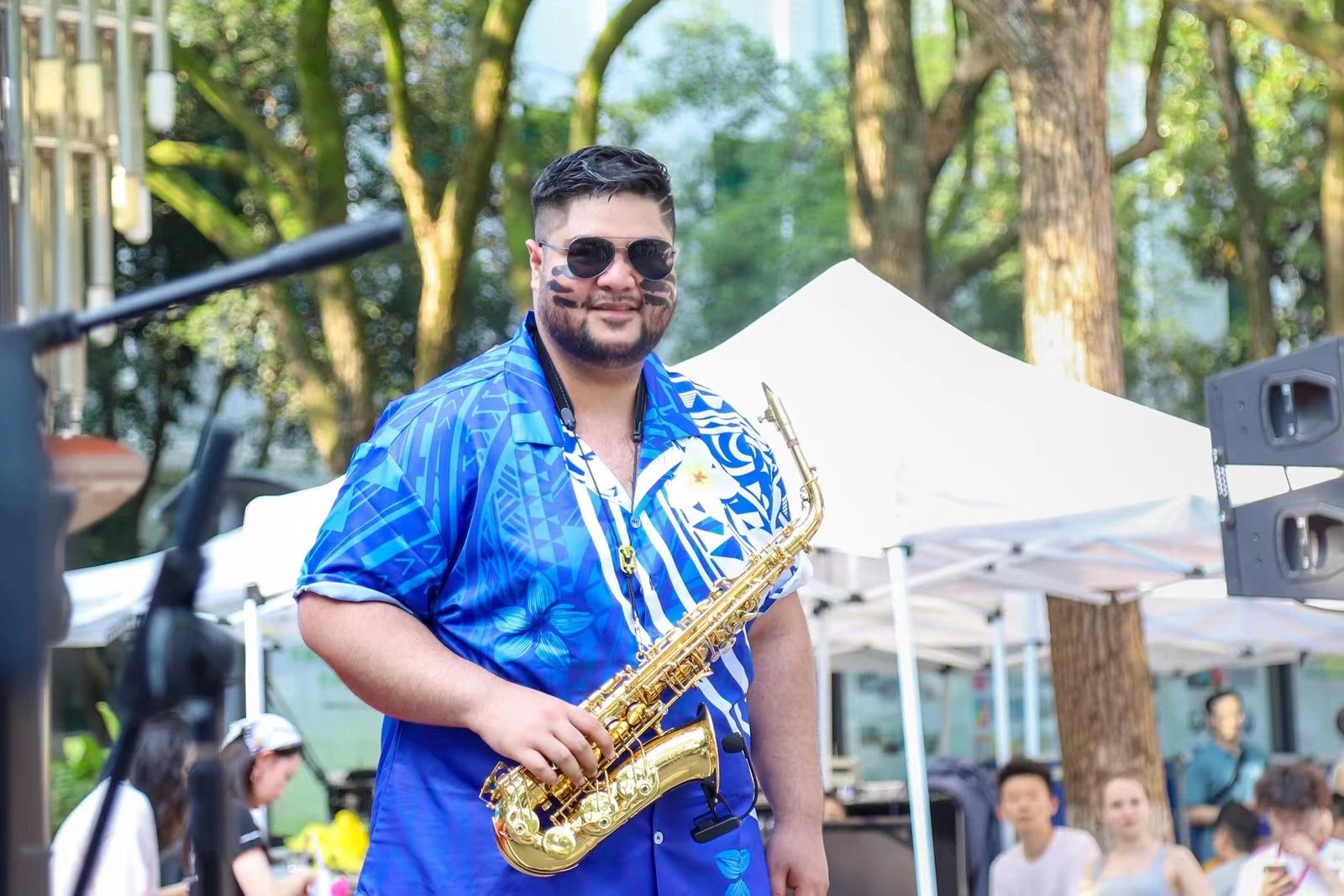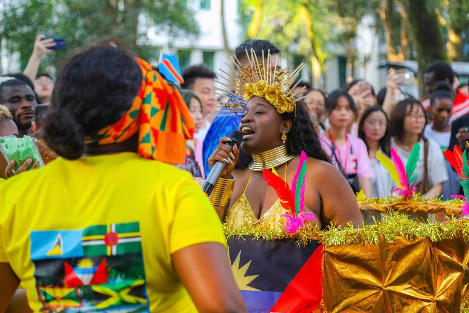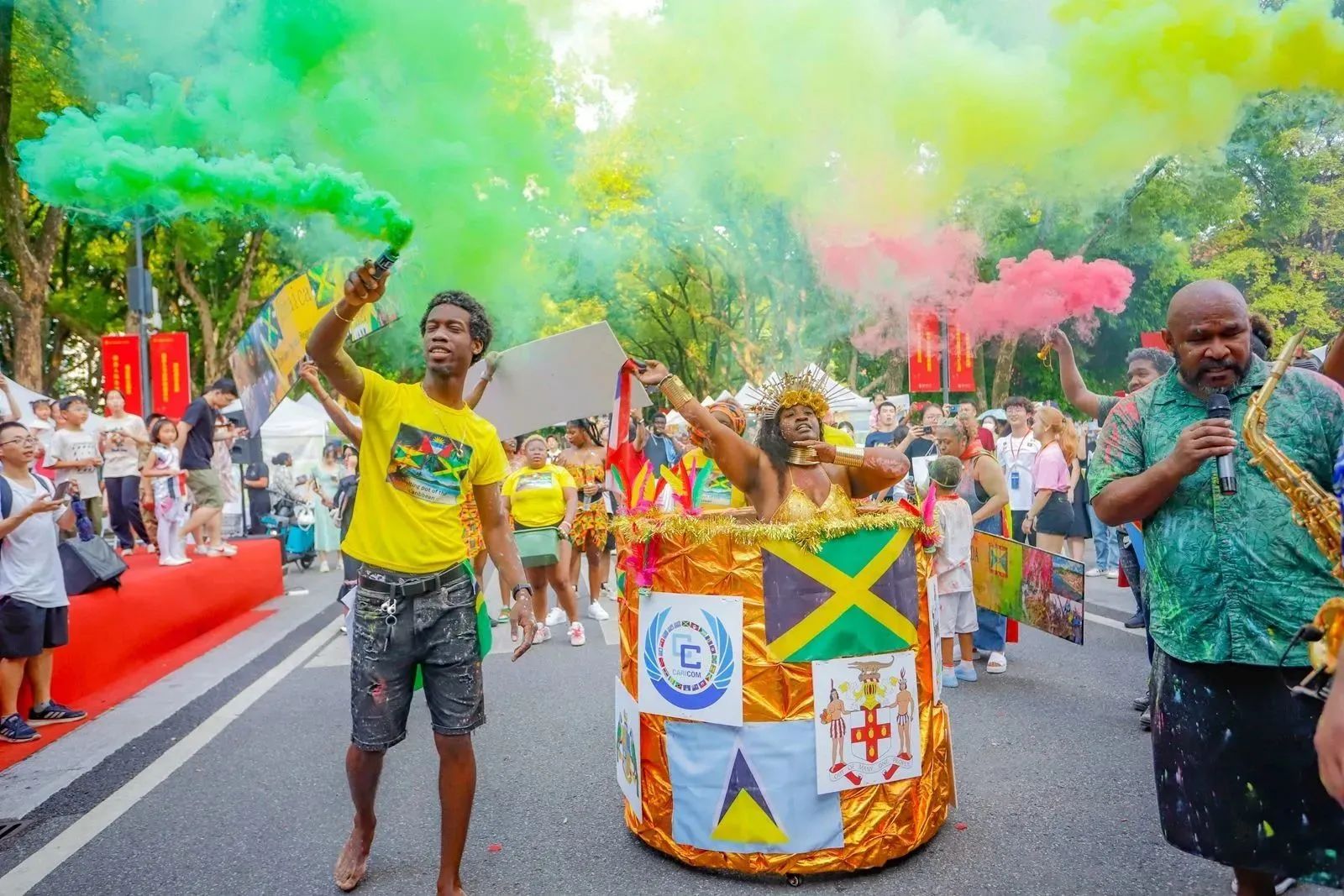 Bathing in the sunlight and surrounded by numerous people, the bands from different countries began to play instruments. Despite different nationalities, people at present shared the same joy. After the performance, the mist of various colors bloomed on Gui Zhong Road, bringing the atmosphere to a climax.